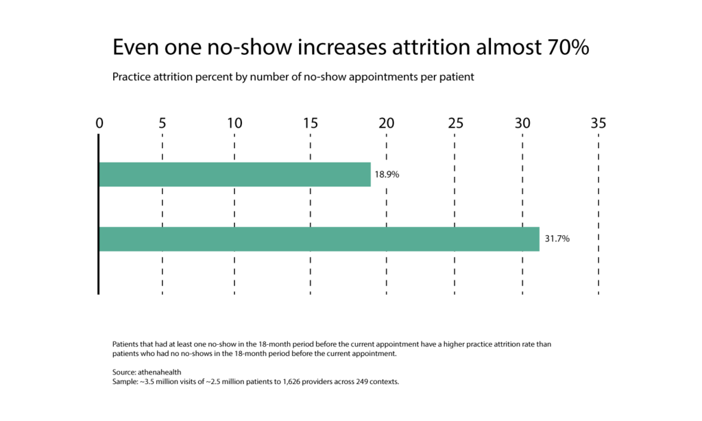In a study, conducted by athenahealth, it was reported that just one missed appointment increases patient attrition by nearly 70%.