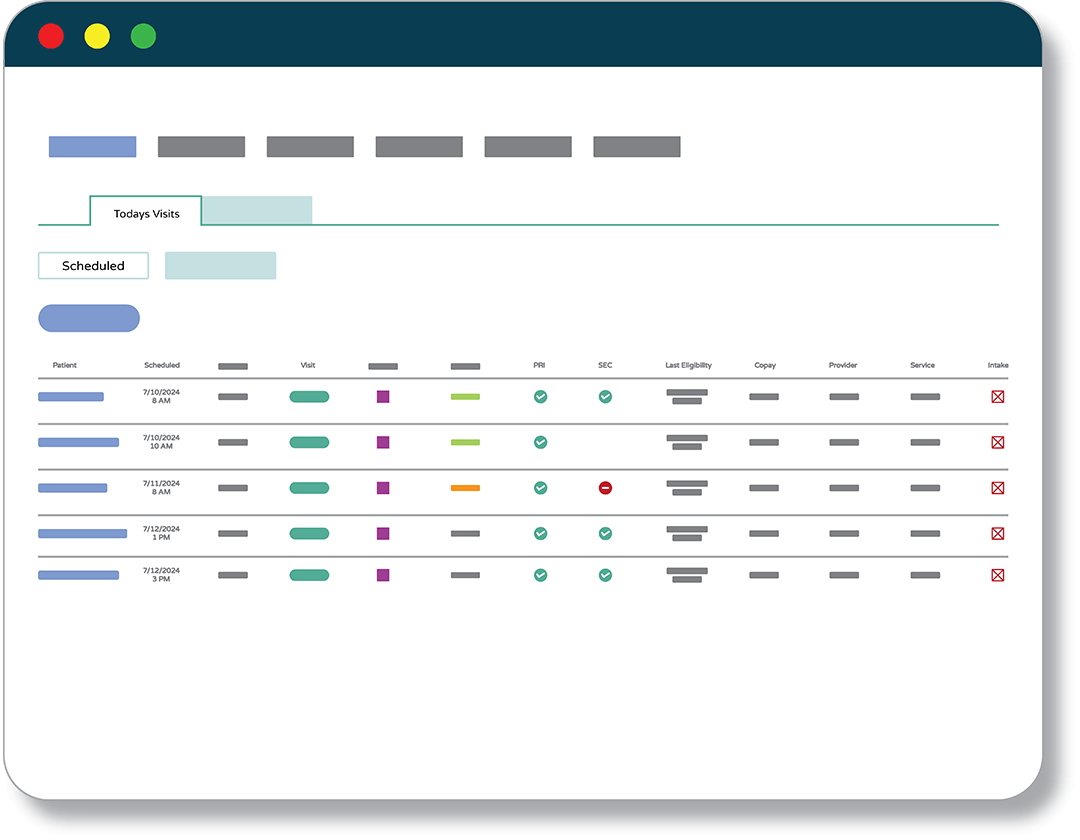 Front Desk and Billing staff can quickly filter and sort appointments through interactive patient lists, helping them focus on those that require their attention.